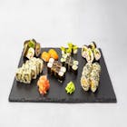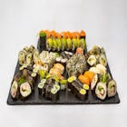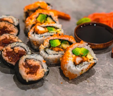 ryż, krewetka, fasolka edamame, ogórek, awokado, goma, nori, sezam, sos orzechowy